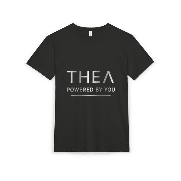 S M L XL 2XL 3XL Length, in 28.00 29.00 30.00 31.00 32.00 33.00 Width, in 19.00 20.50 22.00 24.00 26.00 28.00 Size tolerance, in 1.00 1.00 1.00 1.00 1.00 1.00 Soft, lightweight tee with a modern, neon-inspired logo that reads THEA with a subtle “powered by you” tagline. The sueded finish gives the fabric a gentle, broken-in hand that feels like an old favorite from the first wear. Wear it on casual days when you want a clean, minimalist look with a hint of retro-futuristic energy. The shirt layers easily under jackets or stands alone with jeans for low-effort style that still reads intentional. The understated ribbed crew neck and side seams keep the silhouette tidy over time, while the preshrunk, combed ring-spun cotton blend maintains shape and print clarity after many washes.Product features- 60% combed ring-spun cotton, 40% polyester sueded blend for a soft, lived-in feel- Lightweight fabric (145 g/m²) that layers easily and stays breathable- 1x1 ribbed crew neck that returns to shape- Side seams and preshrunk construction for lasting fit- Sewn-in label and quality construction sourced from Nicaragua/HondurasCare instructions- Non-chlorine: bleach as needed- Tumble dry: low heat- Do not iron- Machine wash: cold (max 30C or 90F)